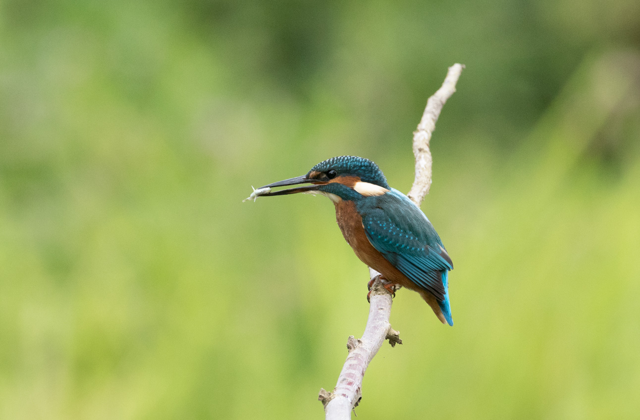 Kingfishers stand very still on sturdy perches 1-3m above the water, and scan for fish. (They can hover over the water if there is no suitable perch). They prefer slower-flowing water of a fairly shallow depth. They dive into the water to catch fish (up to about 10cm long) in their bills. Favoured prey includes Minnows, Sticklebacks, and Bullheads.